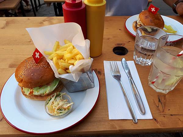 我們倆也坐下點餐,不知道是不是真的餓了還是怎樣?這裡的漢堡、薯條口味真不錯,漢堡肉的味道很乾淨俐落,肉汁恰到好處,咬下去很飽滿又不會油膩。價格也很合理,20多塊錢瑞郎,雖然比起麥當勞貴上一截,但口感跟用餐體驗絕對遠勝於麥當勞!